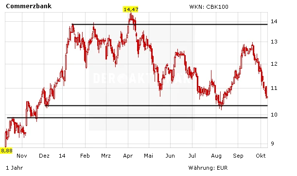 Seit knapp einem Jahr pendelt der Kurs der Commerzbank zwischen 10,50 und 14,00 Euro. Durch die jüngsten Verluste steht der Wert inzwischen unmittelbar vor einem Test der unteren Begrenzung. Fällt der Titel unter diese wichtige Marke, drohen bald einstellige Kurse. Die nächste stärkere Unterstützung findet sich erst bei rund 9,90 Euro. Im schwachen Marktumfeld erscheint dieses Szenario durchaus wahrscheinlich. Eine neue Gegenbewegung in Richtung des Bereichs bei 12,00 Euro ist dementsprechend vorerst nicht zu erwarten.