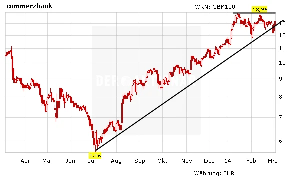 Zwei Szenarien sind denkbar: Die Commerzbank-Aktie bleibt oberhalb des Aufwärtstrends und nimmt langsam Kurs in Richtung 14 Euro. Dort verläuft ein markanter horizontaler Widerstand. Gemeinsam mit der Aufwärtstrendlinie hat sich damit eine Dreiecksformation ausgebildet. Bricht die Aktie aus dem Dreieck aus, heißt: fällt der Widerstand bei 14, bedeutete dies ein starkes Kaufsignal.