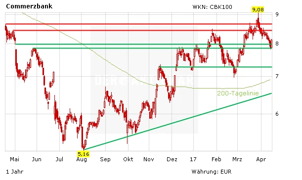 Fundamental ist die Commerzbank auf den ersten Blick mit einem KGV von 16 hoch bewertet. Die Gesamtbranche liegt nur bei 13. Das Kurs-Buchwert-Verhältnis des Konzerns erreicht dagegen 0,35, während vergleichbare Banken im Mittel auf 0,85 kommen. DER AKTIONÄR sieht bei der Commerzbank noch Potenzial bis 10,70 Euro. Anleger sollten bei 7,00 Euro einen Stopp setzen