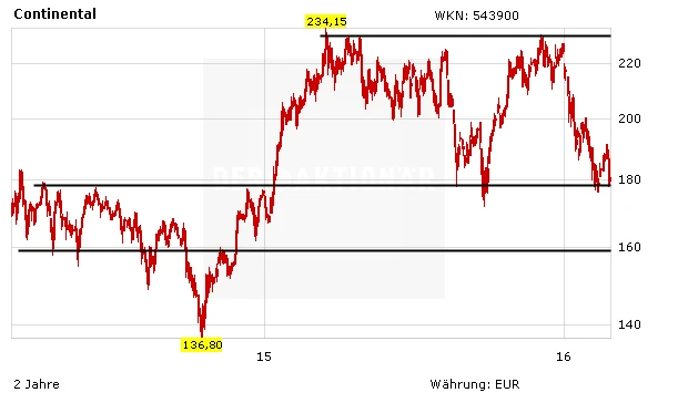 Ende November notierte die Conti-Aktie nur knapp unterhalb des Allzeithochs bei 234,15 Euro. Seitdem geht es mit den Papieren des Autozulieferers allerdings abwärts. Derzeit notiert der Titel an der wichtigen 180-Euro-Marke. In diesem Bereich verläuft die untere Begrenzung des langfristigen Seitwärtskorridors. Sollte diese Unterstützung nicht halten, drohen weitere Verluste bis in den Bereich von 160 Euro. Bei einer Trendwende dürfte jedoch auch die 200-Euro-Marke schnell wieder in das Visier der Aktie rücken.