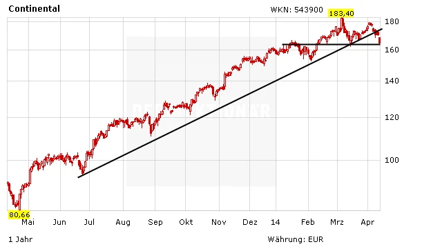 Fällt die Notierung nachhaltig unter diese Marke, dürften die Bären vorerst die Oberhand gewinnen und es droht ein weiterer Rutsch in den Bereich von 150,00 Euro. Die Analysten sind trotz der jüngsten Kurschwäche weiterhin optimistisch. Die französische Investmentbank Exane BNP Paribas hat die Einstufung für Continental auf "Neutral" mit einem Kursziel von 180 Euro belassen. Der europäische Autoabsatz dürfte im März vor allem wegen der starken Nachfrage in Großbritannien um etwa zehn Prozent zugelegt haben, schrieb Analyst Stuart Pearson in einer Branchenstudie.