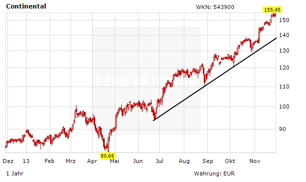Die Aktie von Continental präsentiert sich seit Monaten extrem trendstark. Der DAX-Titel hat alle charttechnischen Widerstände mit Bravour gemeistert. Für Unterstützung sorgten zuletzt die guten Zahlen für das dritte Quartal. Auch für das restliche Geschäftsjahr ist der Konzern zuversichtlich.