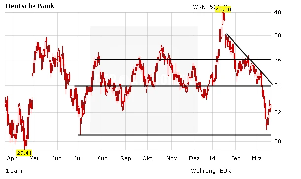 Die zahllosen Skandale um die Deutsche Bank hatten in den vergangenen Monaten die Kurse belastet. Zumindest aus charttechnischer Sicht hat sich das Bild wieder verbessert. Schafft es die Aktie über die Marke von 34 Euro, ist sogar mit einer dynamischen Anschlussrallye zu rechnen. Spätestens bei einem Ausbruch sollten trading-orientierte Anleger einsteigen.