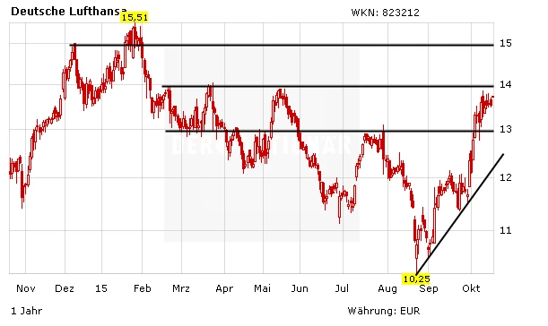 Bei 14 Euro verläuft ein massiver horizontaler Widerstand. Gelingt der Lufthansa-Aktie der Sprung über diese Hürde, würde sich das ohnehin verbesserte Chartbild noch einmal deutlich aufhellen. Nach oben wäre der Weg bis zur Marke bei 14,90 Euro frei. Im steilen kurzfristigen Aufwärtstrend kann es dann auch zügig zu einem Angriff auf das Jahreshoch bei 15,51 Euro kommen. Sollte sich der Widerstand als zu robust erweisen, wartet bei 12,90 Euro eine starke Unterstützung, die den Kurs vor größeren Verlusten absichern sollte.