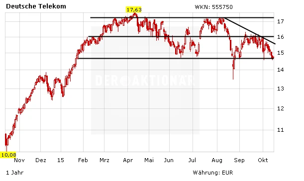 Spannend ist auch das Chartbild bei der Deutschen Telekom. Seit Monaten pendelt die Aktie seitwärts zwischen 14,70 und 17,30 Euro. In dieser Woche kam es zu einem erneuten Test der unteren Begrenzung des Trends. Der kurzfristige Abwärtstrend bleibt allerdings intakt. Fällt der Kurs doch noch unter die wichtige Marke, drohen weitere Verluste bis in den Bereich der 14-Euro-Marke. Sollte die Aktie im freundlichen Marktumfeld den Rückenwind mitnehmen, würde nach oben der Widerstand bei rund 16 Euro kurzfristig in den Fokus rücken.