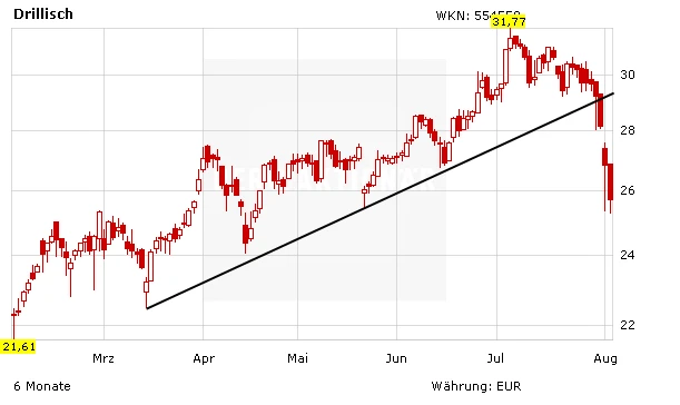 Nach der beispiellosen Rallye der vergangenen Monate ist die Luft für Bullen mittlerweile dünn geworden. Bereits in der vergangen Woche rutschte die Drillisch-Aktie unter die horizontale Unterstützung im Bereich der 28-Euro-Marke. Damit wurde auch der Aufwärtstrend gebrochen.