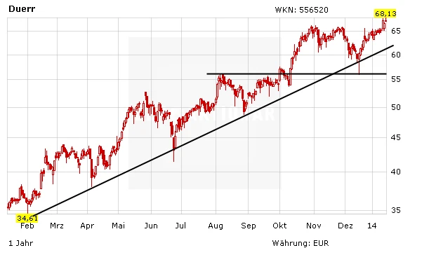 Nach dem Rücksetzer auf die horizontale Unterstützung bei 56,21 Euro, befindet sich die Dürr-Aktie wieder auf der Überholspur. Der MDAX-Titel ist am Mittwoch auf ein neues Allzeithoch bei 68,13 Euro gestiegen.