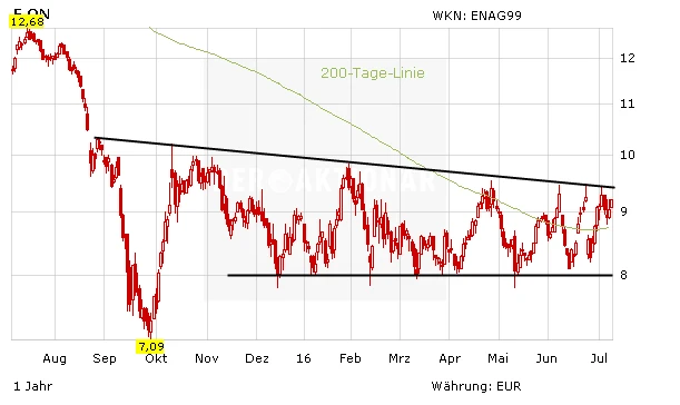 Aus charttechnischer Sicht ist die Situation bei E.on vielversprechend. Durch die jüngsten Kursgewinne notiert die Aktie knapp unterhalb des leicht fallenden Abwärtstrends bei 9,50 Euro. Dieser grenzt den Seitwärtskorridors nach oben ab. Gelingt der Sprung über diese Marke und die Hürde beim horizontalen Widerstand bei etwa 10,00 Euro, wäre der Weg nach oben frei. Nach unten sichert zunächst die 200-Tage-Linie bei 8,75 Euro ab. Eine weitere robuste Unterstützung bietet die 8,00-Euro-Marke als untere Begrenzung des Korridors.