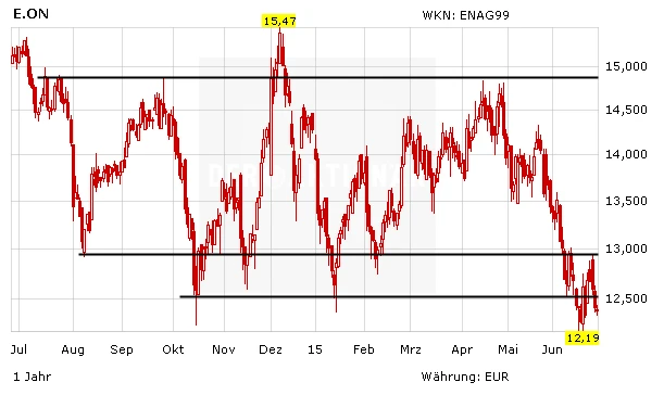 Am Mittwoch waren E.on-Titel nach Medienberichten zur Kohle-Abgabe noch auf ein Zwischenhoch bei 12,95 Euro geklettert. Doch inzwischen gehört die Euphorie bereits wieder der Vergangenheit an. Charttechnisch hat sich die ohnehin kritische Situation weiter eingetrübt. Inzwischen notiert der DAX-Titel unterhalb der wichtigen Unterstützung bei 12,50 Euro – hier verläuft die untere Begrenzung des langfristigen Seitwärtstrends. Statt den Blick nach oben in Richtung des Widerstands bei 13,00 Euro zu richten, müssen Anleger nun also wieder nach unten schauen. Hier wartet bei rund 12,00 Euro die letzte Unterstützung, ehe charttechnisch der freie Fall droht.