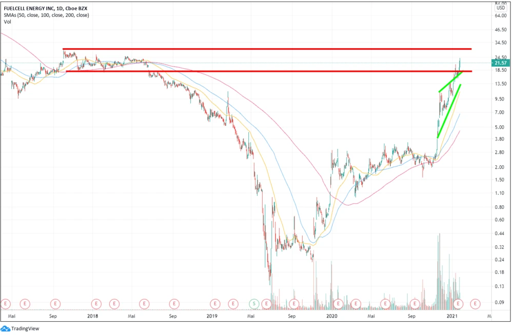 Die Quartalszahlen, die FuelCell am 21. Januar veröffentlich hatte, verfehlten die Erwartungen der Analysten. Trotzdem bewegt sich Aktie seitdem steil nach oben. Dabei kam es bei 16,20 Dollar an der oberen Begrenzungslinie der Keilformation, die der Wert zwischen November und Januar ausgebildet hatte, zu einem Rebound.