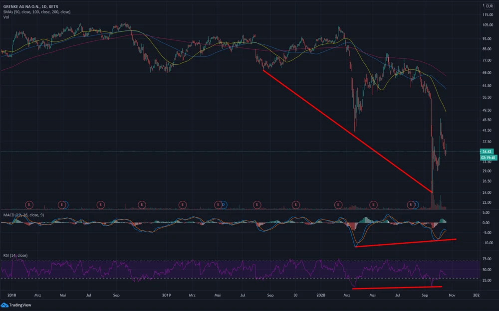 Bleibt es nun dabei, dass die Vorwürfe gegen das Unternehmen haltlos sind, hat die Aktie aus charttechnischer Sicht großes Gewinnpotenzial. Denn beim Blick auf die gängigen Indikatoren (MACD und Stochastik) zeichnet sich eine so genannte bullishe Divergenz ab. Das bedeutet wiederum, dass der Kurs neue Tiefs markierte, während die Indikatoren-Werte deutlich weniger gefallen sind (siehe Chart). Dieses Muster signalisiert in der Regel eine baldige Trendumkehr.