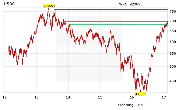 Ausgerechnet seit dem Brexit-Votum im Juni des vorangegangen Jahres hat die Aktie der HSBC fast 120 Prozent zugelegt. Der mittelfristige Aufwärtstrend ist intakt, aus charttechnischer Sicht spricht alles für eine Fortsetzung der Rallye. Wird der nächste Widerstand bei 7,00 £ übersprungen, liegen die nächsten Hürden bei 7,20 £ beziehungsweise 7,62 £. Als Unterstützungen dienen die Marke von 6,83 £, sowie die 200-Tage-Linie bei 5,64 £.