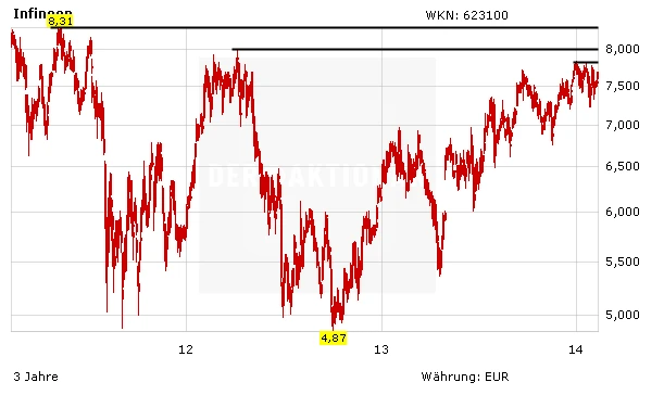 Die Infineon-Aktie zählt heute zu den stärksten Werten im DAX. Durch den Kurssprung nimmt die Aktie zum wiederholten Mal Anlauf auf den massiven Widerstand bei 7,80 Euro. Gelingt nun endlich der Ausbruch?