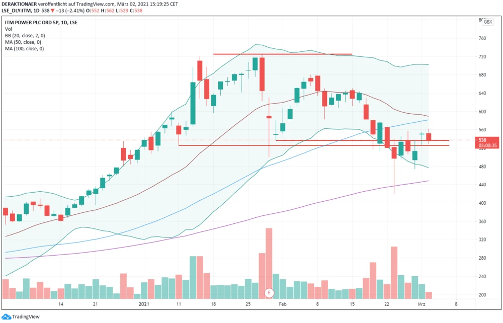 Das Chartbild der ITM-Power-Aktie ist nach dem Abverkauf noch immer eingetrübt. Wichtig ist jetzt, dass der Bereich zwischen 525 und 536 Pence standhält. Ansonsten drohen erneute Rücksetzer.