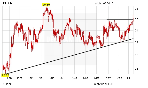 Die Papiere des Industrieroboterherstellers KUKA sind am Mittwoch in einem freundlichen Marktumfeld über den horizontalen Widerstand bei 36,00 Euro geklettert. Damit wurde ein neues Kaufsignal ausgelöst. Der Weg ist nun frei bis zum Allzeithoch bei 38,59 Euro. Gelingt auch noch der Ausbruch über diese Hürde, wäre der Seitwärtstrend der vergangenen Monate Geschichte.