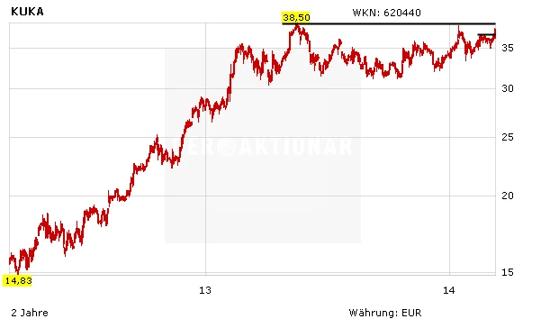 Damit ist der Weg nun frei bis zum alten 52-Wochen-Hoch bei 38,50 Euro. Zuletzt äußerten sich auch die Analysten optimistisch. Die Investmentbank Barclays hat zuletzt die Einstufung für KUKA mit „Overweight“ und einem Kursziel von 40,00 Euro bestätigt. Mit der Übernahme von Alema Automation stärkt KUKA seine Position in der Luftfahrtindustrie - einer Branche mit erheblichem Wachstumspotenzial, so Analyst James Stettler in einer Studie.