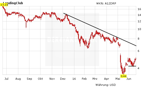 Nach dem überraschenden Rücktritt von CEO Renaud Laplanche ist die Aktie von LendingClub Mitte Mai bei 3,44 Dollar auf ihren bisherigen Tiefststand gefallen. Seitdem hat der Kurs aber bereits wieder deutlich zulegen können. Nun gilt es, die 5-Dollar-Marke nachhaltig zu überspringen – Anfang Juni war ein erster Erholungsversuch noch daran abgeprallt.