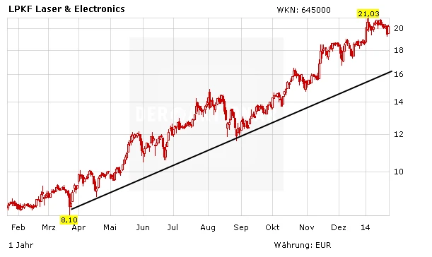 Bei 21,03 Euro markierte das Papier pünktlich zum Jahresstart ein neues Mehrjahreshoch. Dort geriet die LPKF-Aktie dann nach einer monatelangen Rallye leicht in Stocken. Der Kurs bröckelte ab und drohte unter das alte Ausbruchsniveau bei 19,00 Euro zu fallen. Nachdem die Bullen nun wieder das Steuer übernommen haben dürfte auch ein Ausbruch über das alte Bewegungshoch nur noch eine Frage der Zeit sein.