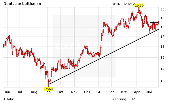 Neben der Charttechnik überzeugt auch der Newsflow der Fluggesellschaft. Die Lufthansa kündigte zuletzt an, ihre finanzielle Lage trotz höherer Investitionen deutlich zu verbessern. Das Sparprogramm Score soll der Fluggesellschaft dabei helfen dieses Ziel zu erreichen. Dank des Programms soll der operative Gewinn bis zum Jahr 2015 auf 2,65 Milliarden Euro steigen. Für 2014 rechnet das Management mit einem Ergebnis von 1,3 bis 1,5 Milliarden Euro. Finanzchefin Simone Menne peilt zudem sowohl bessere Noten der Ratingagenturen als auch eine höhere Eigenkapitalquote an. Mittelfristig soll diese Kennziffer auf 25 Prozent ansteigen. Zuletzt lag die EK-Quote bei 18 Prozent.
