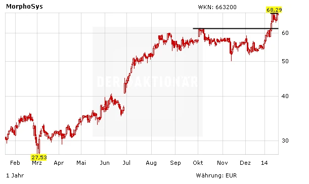 Die Morphosys-Aktie ist Anfang des Jahres nach einer wochenlangen Seitwärtsbewegung über die 62-Euro-Marke auf ein neues Mehrjahreshoch gestiegen. Im Zuge der Aufwärtsbewegung wurde auch das alte Zwischenhoch bei 66,33 Euro aus dem Jahre 2001 überwunden. Nach einer kurzen Konsolidierung notiert die Biotechaktie bereits wieder unter dem alten Bewegungshoch bei 68,30 Euro.
