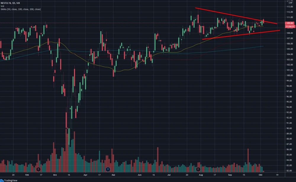 Seitdem die Nestlé-Aktie Ende Juli nur knapp das Allzeithoch bei 113,20 CHF verfehlte, konsolidiert der Wert in Form einer symmetrischen Dreiecksformation. Dabei schwankt der Kurs fortlaufend um die Widerstandslinie, die vom Februar-Hoch bei 110,20 CHF ausgeht.