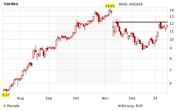 Der Newsflow bei Nordex dürfe also weiter positiv bleiben. DER AKTIONÄR spekuliert daher im Real-Depot weiter auf eine Fortsetzung der Aufwärtsbewegung. Gelingt der Ausbruch über das Zwischenhoch bei 12,25 Euro sollte der Kurs zügig bis in den Bereich von 13,00 Euro steigen.
