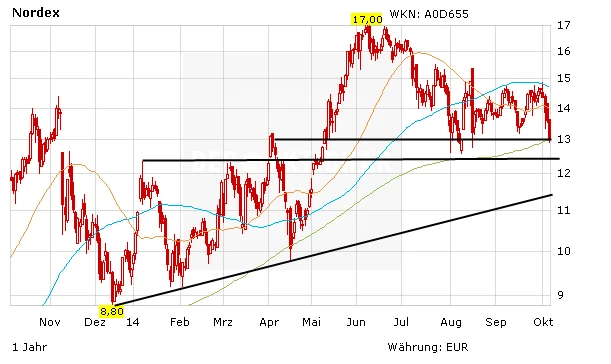 Die fundamentalen Rahmendaten sind nach wie vor gut. Die Nordex-Story ist intakt. Bis 2017 soll der Umsatz auf zwei Milliarden klettern, die EBIT-Marge dabei weiter steigen. Am Montag hat Nordex bekannt gegeben, man habe die Partnerschaft mit dem Lieferanten Carbon Rotec verlängert.
