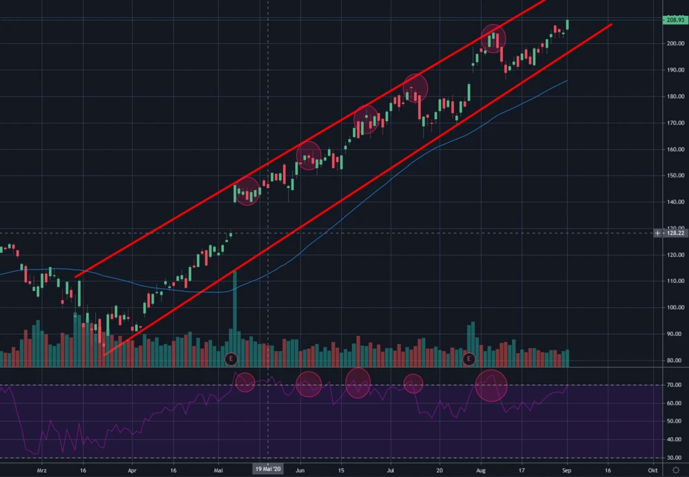 Die Aktie von Paypal bewegt sich seit Ende März in einem Aufwärtskanal steil nach oben. Während des Aufstiegs kam es jeweils nur zu sehr kurzen Rücksetzern, die meist nicht länger als drei Tage andauerten.