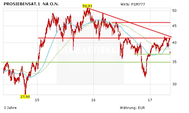 Bereits zum zweiten Mal innerhalb weniger Wochen hatte der Kurs die Marke von 41,50 Euro angesteuert. In diesem Bereich verläuft neben der Abwärtstrendlinie auch ein hartnäckiger Widerstand, den die Aktie seit fast einem Jahr nicht mehr überwinden konnte.