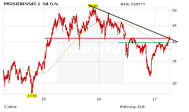 DER AKTIONÄR bleibt zuversichtlich, dass die ProSieben-Aktie in einem freundlicheren Marktumfeld oder bei positiven Unternehmensmeldungen zügig wieder den Vorwärtsgang einlegen und die Erholung fortsetzen wird. Gelingt der erneute Sprung über den Widerstand bei 41,20 Euro, ist aus charttechnischer Sicht Luft bis in den Bereich von 46 Euro. Auf 12-Monats-Sicht traut DER AKTIONÄR der Aktie sogar ein neues Allzeithoch zu.