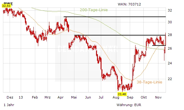 Entscheidend für die nächsten Tage ist, ob der DAX-Wert diesen Trend verlassen kann. Falls dies der Fall ist, dürfte auch der horizontale Widerstand bei 27,96 Euro keine Hürde darstellen. Anschließend hätte RWE Luft bis zum Hoch von April 2013 bei 31 Euro.
