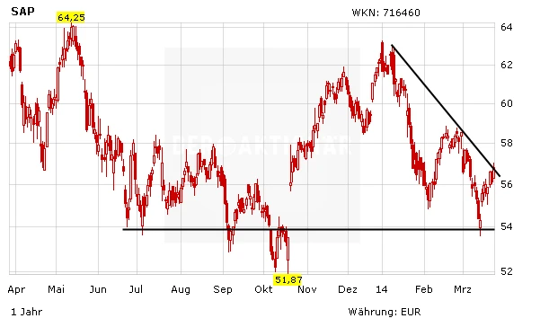 Das Gap zwischen 56 und 54 Euro aus dem Oktober des letzten Jahres wurde Mitte März geschlossen. Der horizontale Widerstand bei 56 Euro wurde im Zuge des jüngsten Kursanstiegs bereits überwunden. Gelingt nun der Ausbruch über die seit Anfang 2014 gültige Abwärtstrendlinie wird ein neues Kaufsignal ausgelöst und die Bullen dürften endgültig das Ruder übernehmen.