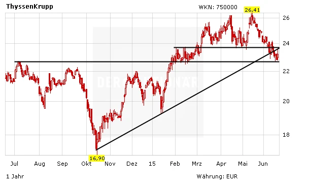 Seit Mai hat Thyssen Krupp zwar rund 15 Prozent an Wert verloren, doch zumindest das Chartbild könnte sich nun wieder aufhellen. Nachdem die wichtige Marke bei 22,60 Euro verteidigt wurde - hier verläuft die massive horizontale Unterstützung – richtet sich der Blick der Anleger wieder nach oben. Die nächste Hürde wartet nun bei 23,70 Euro, an dieser Marke notiert der Kurs nach dem deutlichen Plus am Freitagmorgen inzwischen bereits. Gelingt der Sprung über diese Marke, scheint selbst das Mehrjahreshoch bei 26,41 Euro wieder realistisch.