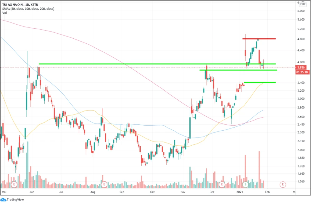 Seit Anfang November, als der erste Zulassungsantrag für einen Corona-Impfstoff gestellt wurde, hat sich die TUI-Aktie mehr als verdoppelt. Nachdem der Wert Ende letzter Woche nun ein neues Verlaufshoch bei 4,83 Euro markiert hatte, setzte er bis an die Unterstützungszone, die zwischen 3,75 und 3,95 Euro verläuft, zurück.