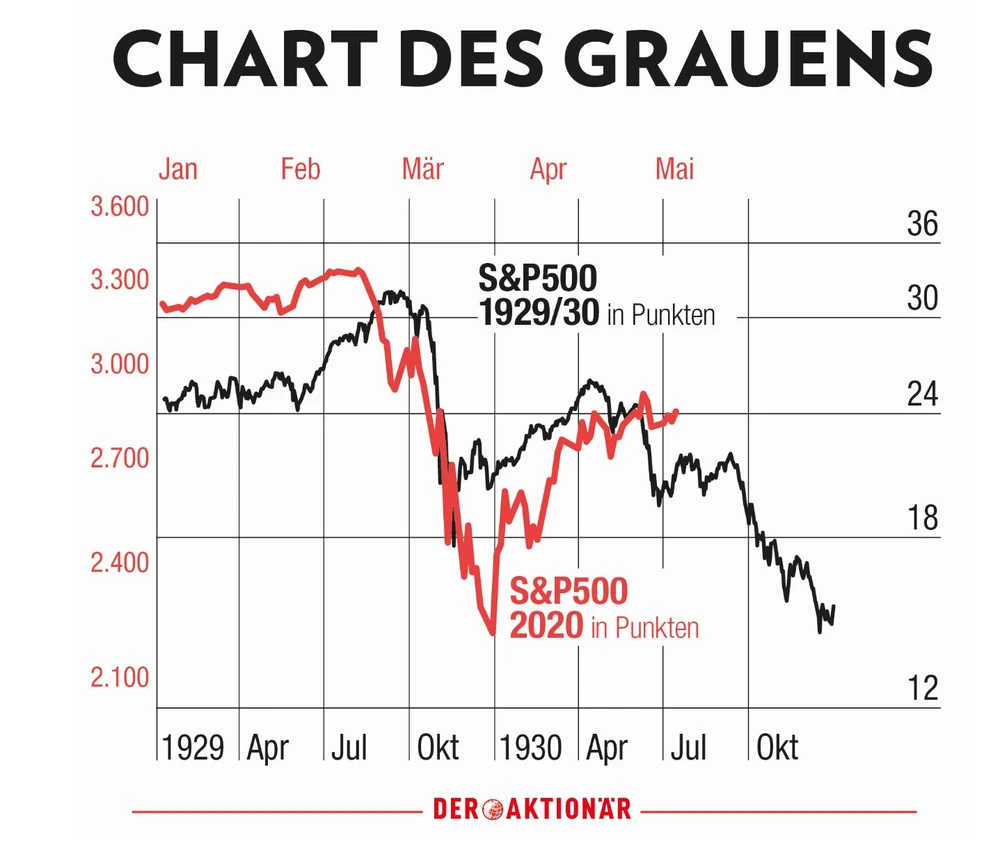 Die Worte sind Wasser auf die Mühlen der Bären. Im Internet macht bereits der „Chart des Grauens“ die Runde – ein Vergleich der Kursentwicklung von 1929 und jetzt. Damals ging es wie heute nach dem Crash nach oben. 1930 kam dann noch ein Crash – und was für einer.