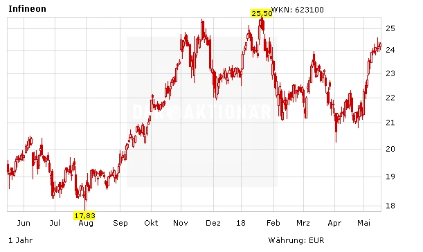 Mit der Vorlage der guten Zahlen zum zweiten Quartal und der leichten Anhebung der Jahresprognose hat der Kurs einen erneuten Angriff auf die 25-Euro-Marke gestartet. Oberhalb notierte die Infineon-Aktie zuletzt im Jahr 2001. Gelingt der Sprung über das bisherige Mehrjahreshoch, wäre der Weg für eine Trendfortsetzung in Richtung 29 Euro geebnet. Hält der operative Trend an, sollte die Aktie von Europas Halbleiterproduzent Nummer 1 seine Aufwärtsbewegung noch einmal beschleunigen und Kurs auf die Rekordstände zur Jahrtausendwende nehmen.