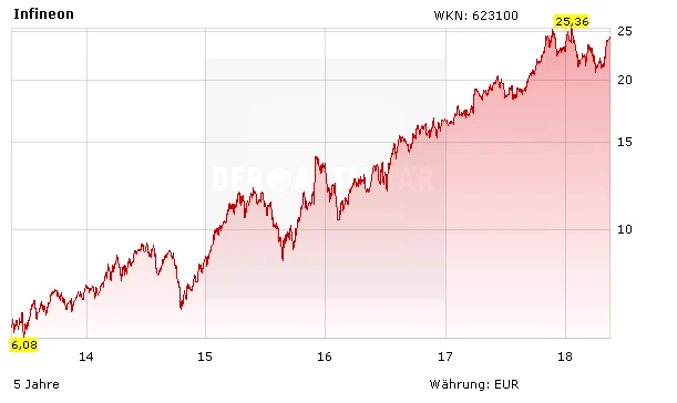 Für Zuversicht bei den Investoren sorgt vor allem der Wandel in der Automobilbranche. Die Megatrends E-Mobilität und autonomes Fahren spielen Infineon in die Karten. Beim Fahrzeugbau werden immer mehr Chips benötigt – und diese stammen häufig vom DAX-Konzern. Hinzu kommt die Entwicklung in China: Im wachstumsstarken Markt hat der Vorstand bereits früh die Weichen gestellt und sich eine starke Position erarbeitet. Die stabile Margenentwicklung trotz negativer Währungseffekte zeigt, wie robust das Geschäftsmodell ist.