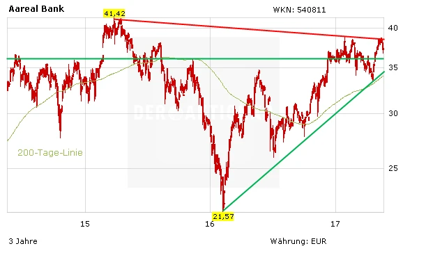 Der langfristige Abwärtstrend ist weiterhin gültig und würde erst bei einem Sprung über 38,54 Euro geknackt werden. Zuvor müsste jedoch der Widerstand bei 38, 26 Euro übersprungen werden. Wird der Abwärtstrend verlassen, lauert die nächste Hürde auf dem Weg in Richtung 40,00 Euro beim Verlaufshoch vom Januar 2017 bei 39,32 Euro. Unterstützung sollte hingegen das Verlaufshoch vom Juni 2014 bei 36,47 Euro bieten. Die 200-Tage-Linie verläuft bei Euro.