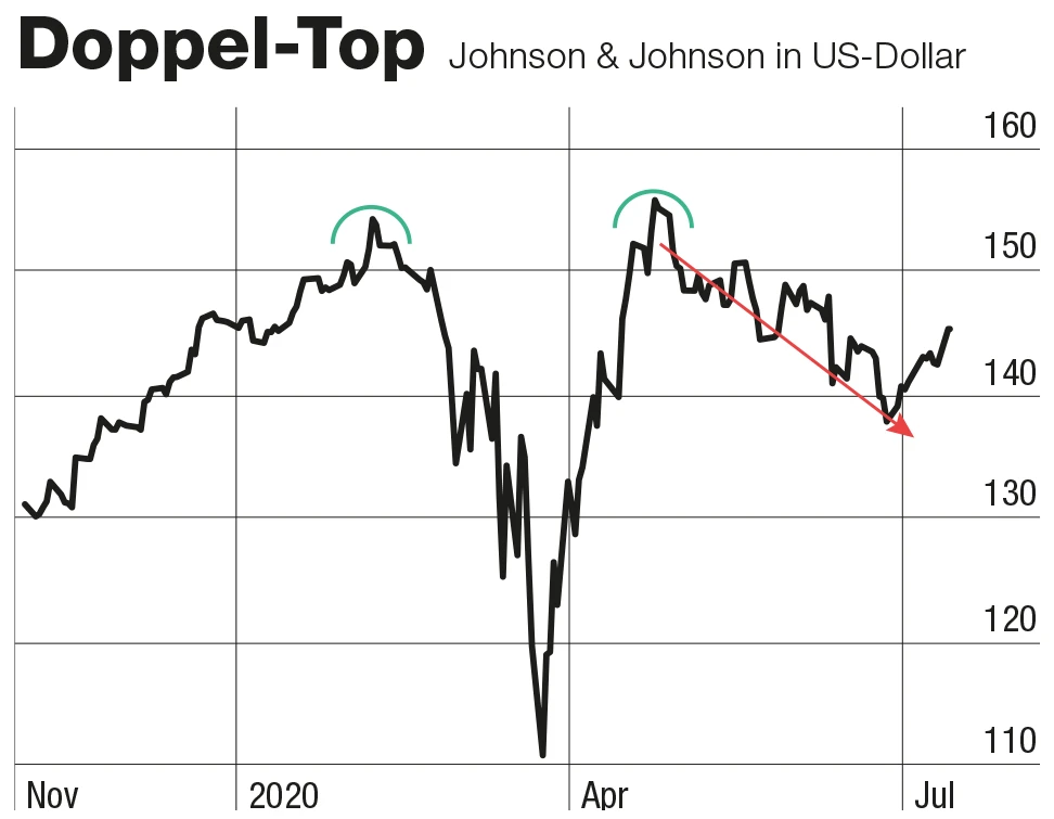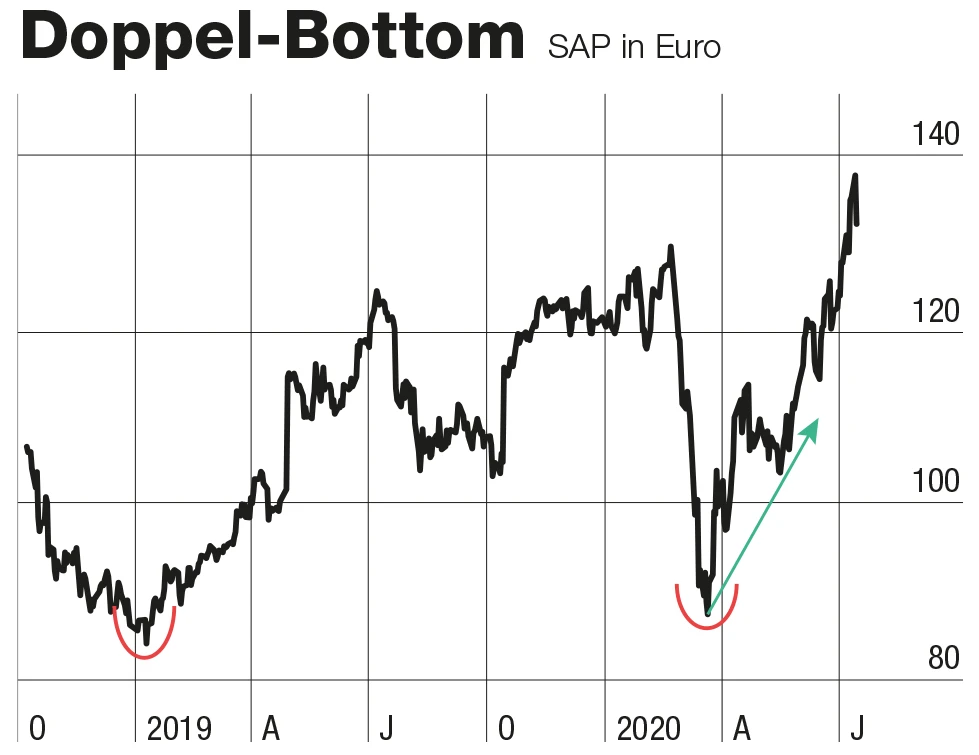Diese beiden Umkehrformationen sind besonders für Einsteiger interessant, da sie relativ häufig auftauchen und einfach zu erkennen sind. Die Formationen werden benutzt, um einen bevorstehenden Trendwechsel zu identifizieren. Bei einem Doppel-Bottom markieren zwei aufeinanderfolgende Tiefpunkte an (annähernd) gleichen Preismarken eine horizontale Unterstützungslinie (siehe Chart). Umgekehrt werden bei einem Doppel-Top zwei Hochpunkte erreicht, die wiederum eine neue Widerstandslinie ausbilden.