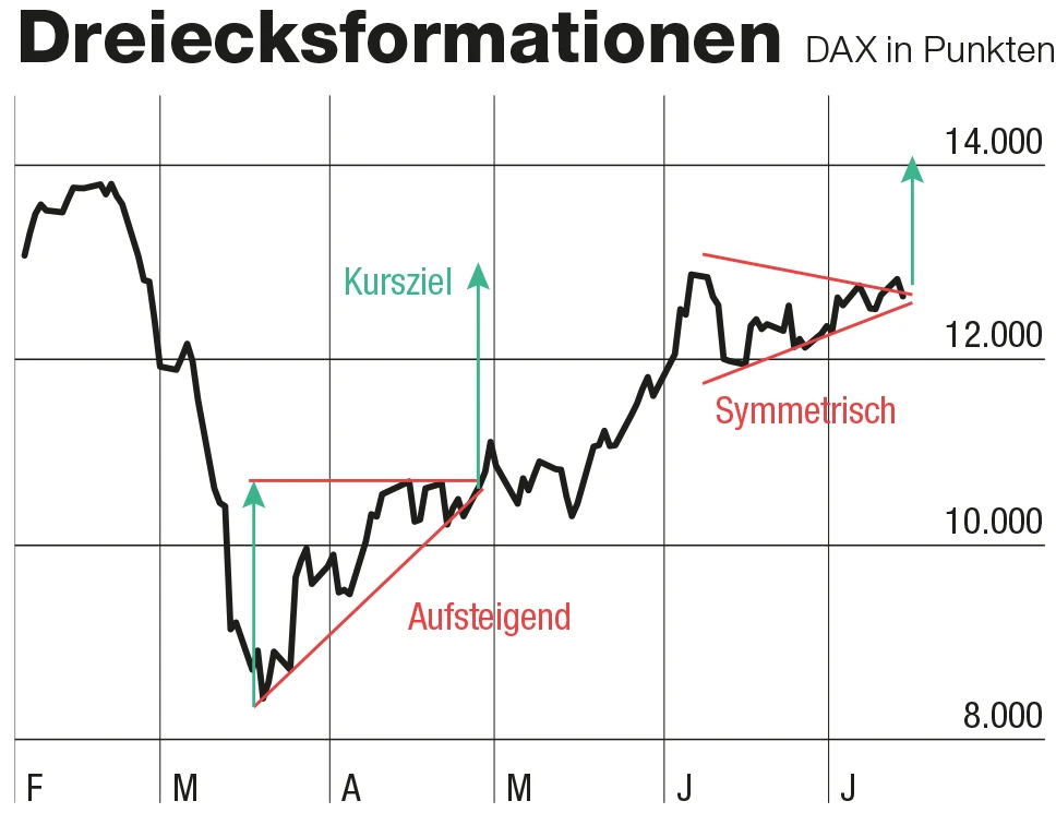 Auch Dreiecksformationen werden genutzt, um die Fortsetzung eines Trends zu identifizieren. Die Charttechnik unterscheidet hier zwischen auf- und absteigenden sowie symmetrischen Dreiecken. Die Grundvoraussetzung für alle drei ist ein vorangegangener Auf- beziehungsweise Abwärtstrend. Ähnlich zu den Flaggen wird die Formation als Verschnaufpause des Trends angesehen. Zur Identifikation verbindet man die Hochpunkte und die Tiefpunkte der Erholungsphase jeweils zu Linien. Laufen diese symmetrisch zusammen, ergibt sich ein symmetrisches Dreieck.