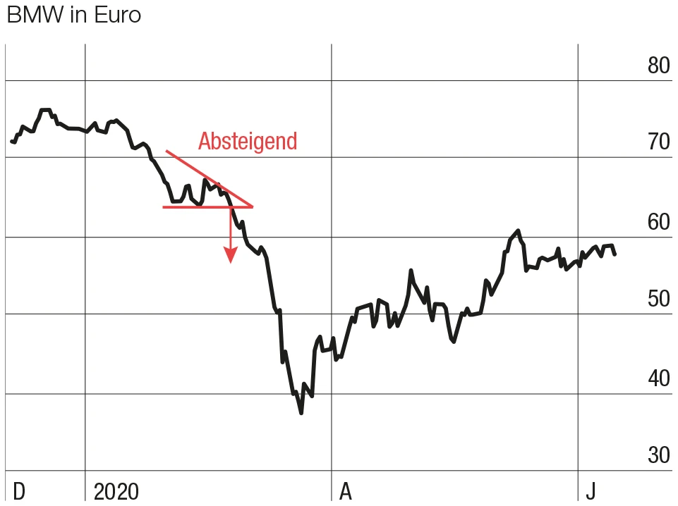 Aufsteigende Dreiecke folgen einem Aufwärtstrend und zeichnen sich durch eine horizontale Widerstandslinie aus. Vice versa beschreiben absteigende Dreiecke Abwärtstrends. Alle Dreiecke haben dabei eine Gemeinsamkeit: Sobald der Kurs aus dem immer spitzer werdenden Dreieck ausbricht, ist mit einer Fortsetzung des jeweiligen Trends zu rechnen. Das Kursziel ermittelt man, indem man den Abstand an der weitesten Stelle des Dreiecks auf den Ausbruchspunkt in Trendrichtung aufaddiert.