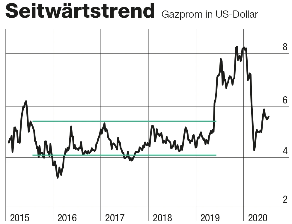 Wie der Name schon sagt, spricht man bei einer längeren Seitwärtsbewegung von einem Seitwärtstrend, alternativ auch Seitwärtskanal oder -range. Die Aktie von Gazprom hing beispielsweise über einen sehr langen Zeitraum hinweg in einer sehr breiten Seitwärtsrange fest. Beim russischen Rohstoff-Riesen sorgte dann im Vorjahr die Ankündigung einer satten Dividendenanhebung für einen regelrecht explosionsartigen Anstieg und den Ausbruch aus dem langjährigen Seitwärtstrend – während der Corona-Crash den Kurs kurzzeitig wieder auf das Niveau der Jahre 2015 bis 2019 trieb.