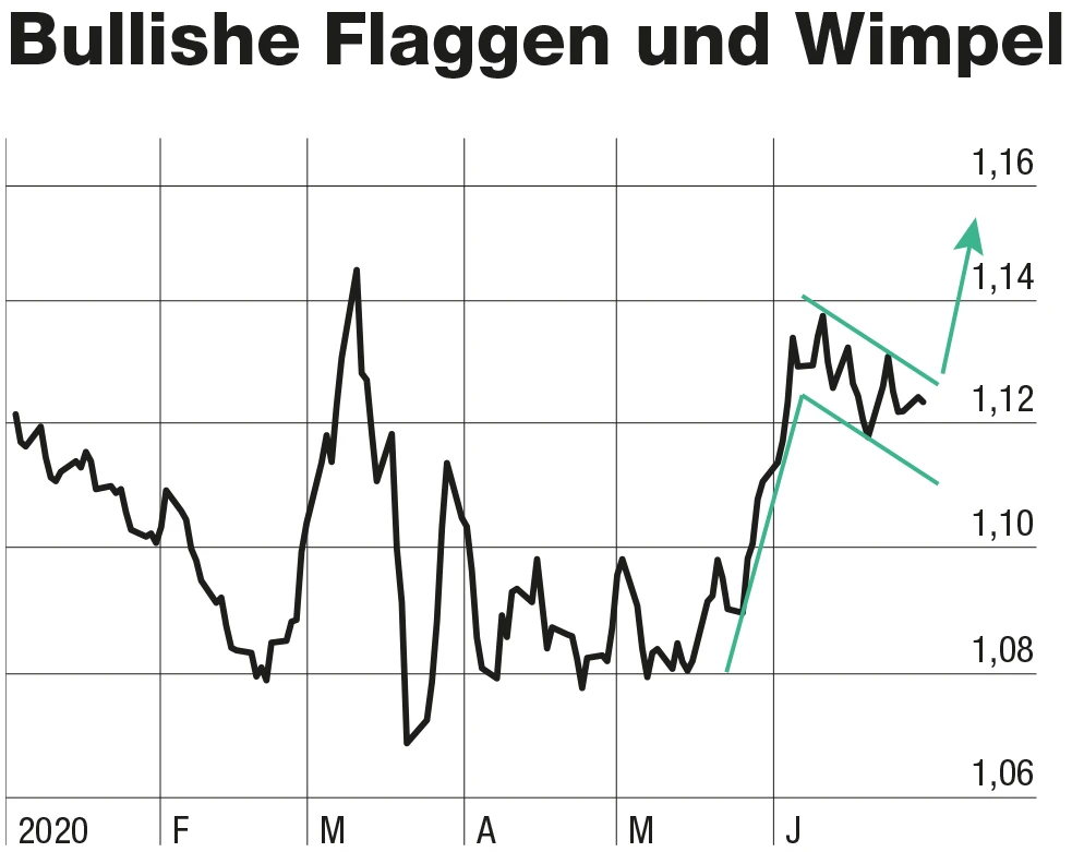 Flaggen und Wimpel sind wohl die bekanntesten Fortsetzungsformationen in der Charttechnik. Die beiden Formationen werden oft zusammen erwähnt, da sie vom Grundaufbau sehr ähnlich sind. Sie tauchen in der Regel während besonders starker Kursbewegungen auf und dienen meist als Konsolidierung für einen weiteren Anstieg. Hierbei formt ein abfallender Kanal die Flaggenformation. Bei Wimpeln nimmt der Kursverlauf dagegen die Form eines symmetrischen Dreiecks an. Beide haben aber eins gemeinsam: Durchbricht der Kurs die obere Widerstandslinie unter hohem Handelsvolumen, wird der Aufwärtstrend wieder aufgenommen. Bei der Ermittlung des Kursziels geht man davon aus, dass die erste starke Aufwärtsbewegung circa die Hälfte des Kursanstiegs darstellt.