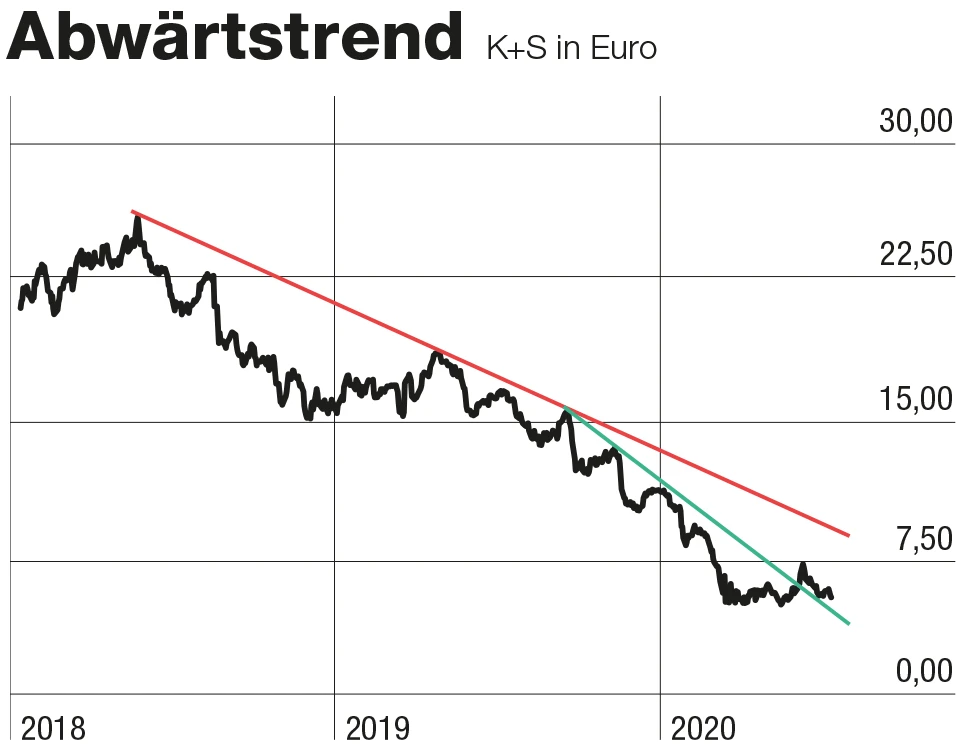 Hingegen ist ein Abwärtstrend natürlich der Albtraum der Anleger. Hier sinken die Zwischenhochs kontinuierlich. Am Beispiel der in den vergangenen Monaten arg gebeutelten Aktie von K+S lässt sich erkennen, dass sich neben dem langfristigen Abwärtstrend sogar ein zweiter, noch steiler verlaufender Abwärtstrend herausgebildet hat, der aber mittlerweile gebrochen werden konnte.