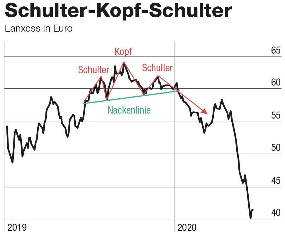 Auch sehr verbreitet ist die Schulter-Kopf-Schulter-Formation (SKS). Diese ist zwar nicht immer leicht zu erkennen, stellt aber dafür eine sehr starke Umkehrformation dar. Wie der Name bereits verrät, besteht die Formation aus drei wesentlichen Bestandteilen: zwei etwa gleich hohen Gipfeln, den Schultern. Dazwischen steht ein dritter höherer Gipfel, der Kopf. Der Start- und Endpunkt des Kopfes werden zu einer Unterstützungslinie verbunden, die auch Nackenlinie genannt wird. Kreuzt der Kurs die Nackenlinie nach unten, ist ein neuer Trend in entgegengesetzter Richtung wahrscheinlich. Vice versa ist diese Formation auch in umgekehrter Form zu behandeln. Misst man den Abstand vom Hochpunkt des Kopfes zur Nackenlinie und projiziert diesen auf den Punkt des Ausbruchs aus der Formation, erhält man das Kursziel.