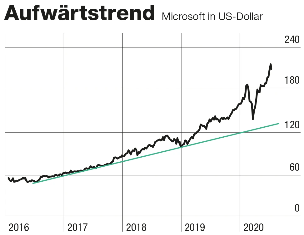 Ein stabiler Aufwärtstrend, bei dem sich eine durchgängige Linie durch die stets steigenden Zwischentiefs einzeichnen lässt, ist natürlich der Traum eines jeden Anlegers. Im Idealfall verläuft der Aufwärtstrend in gemäßigten Tempo und nicht gleich einer Fahnenstange – schließlich sind derart steil verlaufende Aufwärtstrends so gut wie nie wirklich nachhaltig. Ein Musterbeispiel für einen soliden Aufwärtstrend ist aktuell etwa die Aktie des US-Konzerns Microsoft, die bereits seit 2016 über einen stabilen Aufwärtstrend verfügt.
