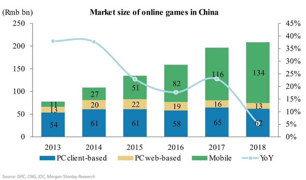 Der Markt für Mobile Games in China wächst seit Jahren rasant und dürfte 2018 trotz der Hürden aus der Politik weiter zugelegt haben. Berechnungen von Morgan Stanley u.a. zufolge könnte die Sparte innerhalb des gesamten Games-Spektrum in der Volksrepublik rund 134 Milliarden Renminbi erreicht haben, ein Plus von 18 Milliarden Renminbi gegenüber 2017.