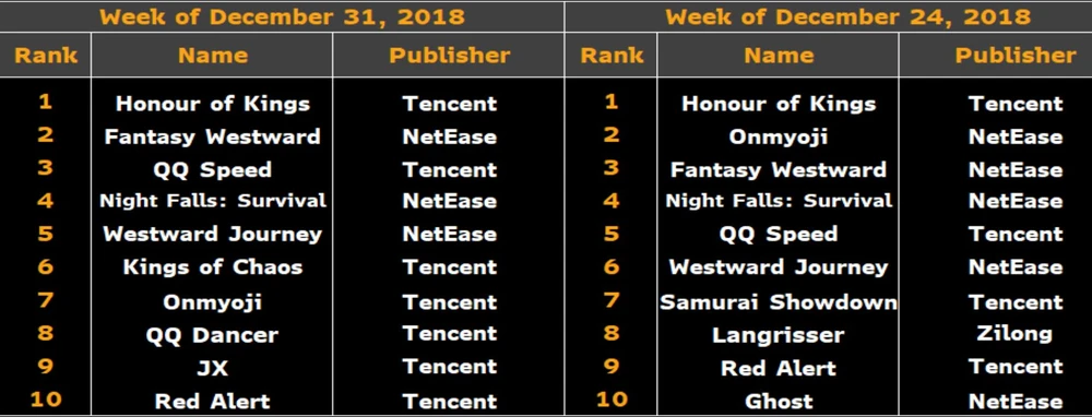Zu den Top-Franchises des Konzerns, der neben der Mobile-Games-Sparte das mit mehr als einer Milliarde Nutzern größte Soziale Netzwerk Chinas betreibt, zählen Honour of Kings, QQ Speed und King of Chaos. Im Zeitraum von Heilig Abend bis Ende Dezember 2018 stammten 7 der 10 populärsten Spiele in der Volksrepublik von Tencent (siehe Grafik).
