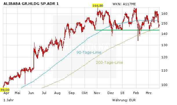 Nach einem starken Jahr 2017 befindet sich die Alibaba-Aktie aktuell in einer Konsolidierungsphase und nähert sich wieder der 200-Tage-Linie an. Buy on Bad News, insbesondere wenn tatsächliche wirtschaftliche Auswirkungen ausbleiben. DER AKTIONÄR behält das Kursziel von 200,00 Euro bei.