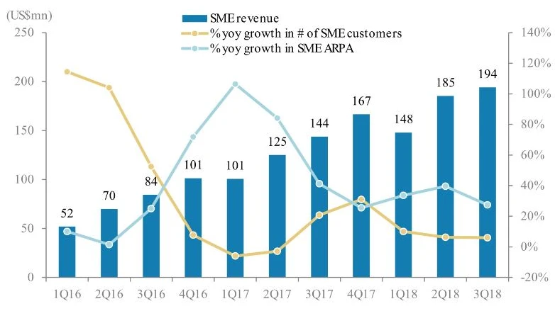 Neben der insgesamt miesen Stimmung für China-Tech sorgten sich die Anleger um die Erlöse aus dem Geschäft mit kleinen und mittelgroßen Unternehmen (siehe Grafik unten), die im 1. Quartal 2018 überraschend stark einknickten.